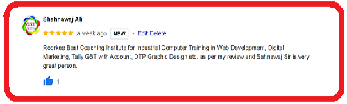 Roorkee Best Coaching Institute for Industrial Computer Training in Web Development, Digital Marketing, Tally GST with Account, DTP Graphic Design etc. as per my review and Sahnawaj Sir is very great person.